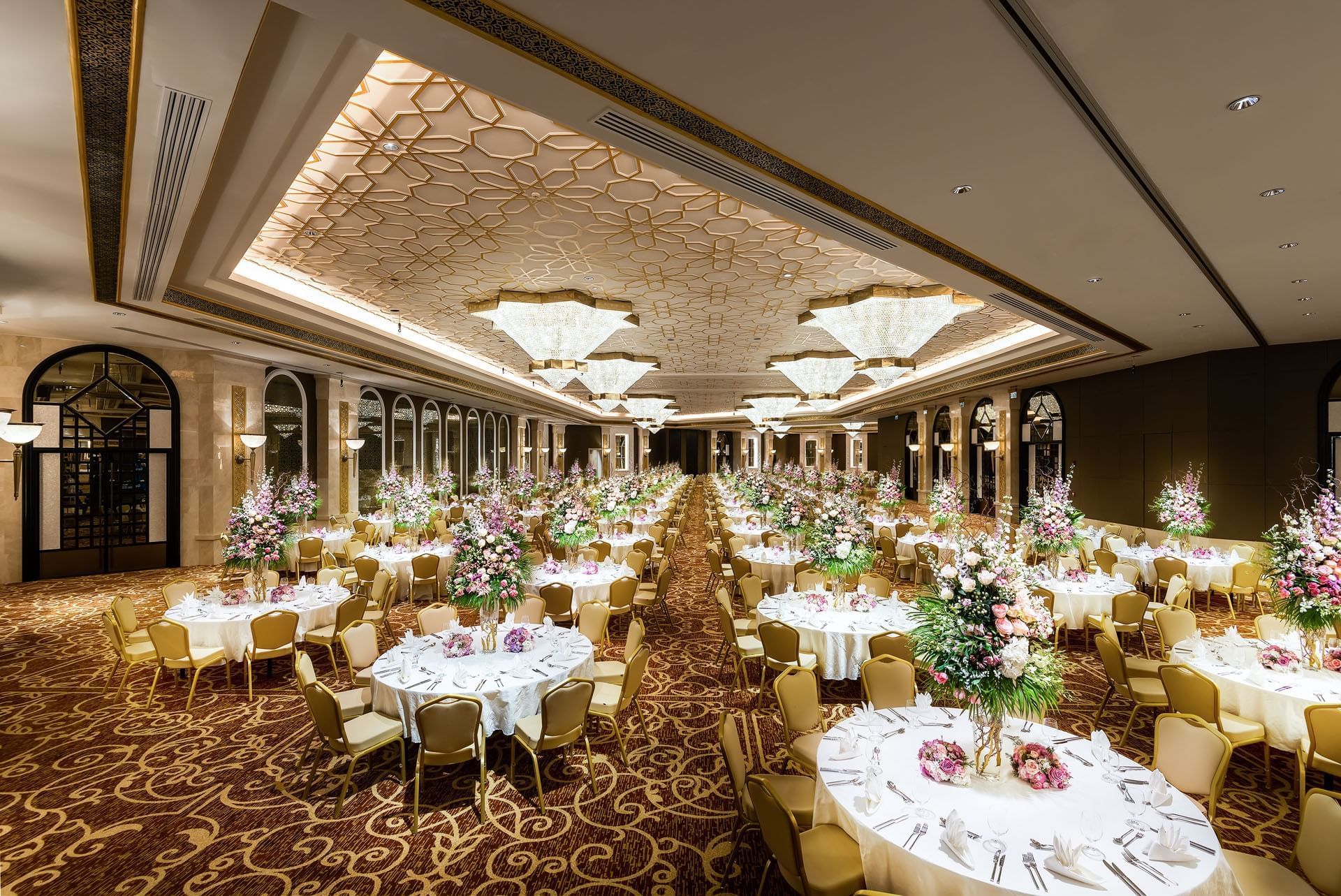Our impressive 1,905 sqm Jawaher ballroom with its high ceilings and grandeur crystal chandeliers, is one of the most glamorous places for weddings in Doha. This exclusive banquet hall with two unique bridal suites attached raises the bar on hospitality and luxury in the city.